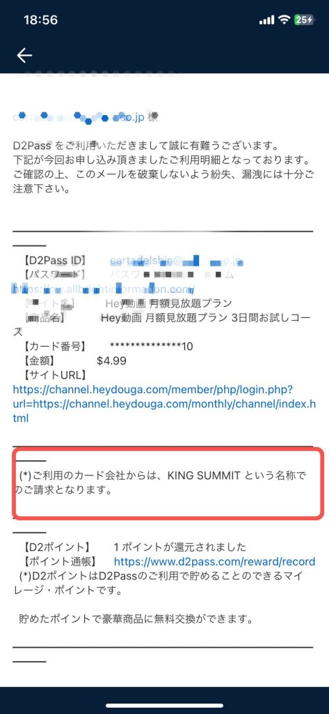 Hey動画の名義で来ることがないので、安心ですが、「KING SUMMIT」という名前をみつけて、架空請求なのでは、なんて怪しまないでくださいね。