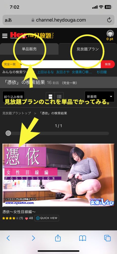 単品販売をクリックして「憑依」で検索すると、月額見放題プランと同じ画面が現れます。